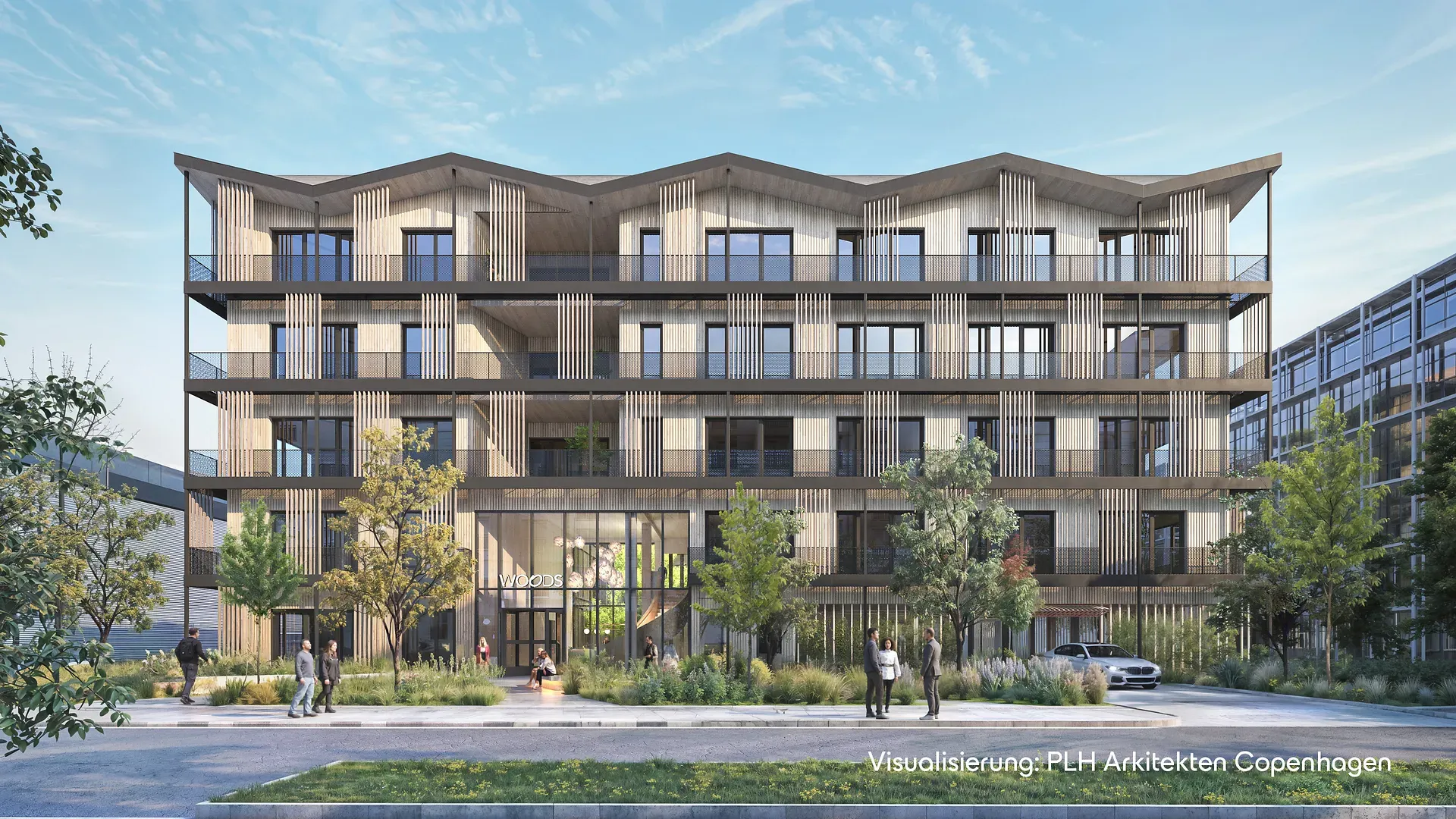Am WOODS Standort entstehen rund 5.700 Quadratmeter Geschossfläche mit bis zu 16 flexibel teilbaren Mieteinheiten. Jede Einheit erhält einen eigenen Zugang zum umlaufenden Balkon. Überdachte Loggien und begrünte Innenhöfe schaffen ein naturverbundenes Arbeitsumfeld. Hochwertige Mobilitätsangebote wie überdachte Fahrradstellplätze, moderne Duschen und Umkleiden sowie VIP-Stellplätze mit Ladeinfrastruktur ergänzen das Konzept. Für die Energieerzeugung nutzt das Gebäude Grundwasser. Die Gestaltung kombiniert sichtbare Holzoberflächen mit Sichtbetonoberflächen in den Treppenhäusern und erfüllt hohe Ansprüche an Design und Interior.